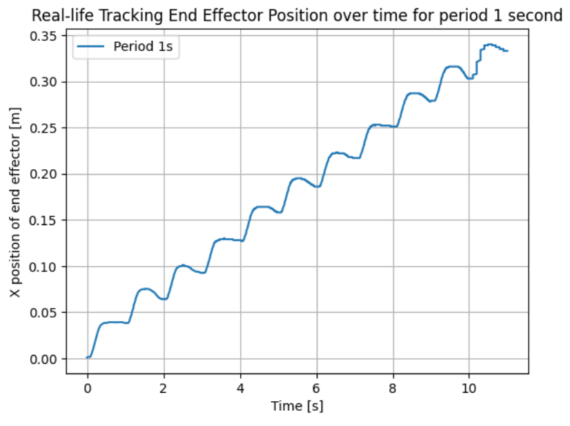 In hardware, the main anomalies are incomplete steps, occasional backward slips, and tracking artefacts. The 2 s dataset contains a clear outlier where the tracked point briefly jumps to roughly twice its nominal x-position before returning; this spike is treated as a measurement error and ignored when interpreting the overall trend. Across periods, the real prototype also shows cycle-to-cycle variability due to hinge sag, servo backlash, and non-uniform pad contact, which explains the rounded “stairs” and small regressions in the experimental plots. These observations point to concrete improvements: refining the MuJoCo model with better servo dynamics (torque and velocity limits, first-order response), calibrated hinge stiffness/damping, and slightly asymmetric or anisotropic friction pads to suppress sideways drift; and improving the physical robot with stiffer hinge reinforcement, higher-contrast and more durable friction pads, tighter servo timing on the ESP32, repeated trials with averaged performance, and more robust tracking (fixed camera, fiducial markers, simple smoothing), all of which should reduce the gap between simulated and measured x-position traces.