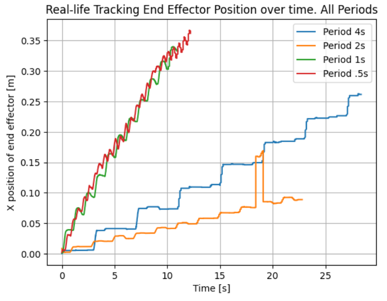 From the tracking data, the 4 s gait moves the end-effector about 0.26 m over roughly 28 s (average speed ≈ 9 mm/s) with strides on the order of 3–4 cm per cycle. The 2 s gait covers only ≈ 0.08 m in about 23 s (≈ 3–4 mm/s) and has much smaller effective strides (~5–10 mm), consistent with the visually noisier, slipping trajectory. In contrast, the 1 s and 0.5 s gaits both travel roughly 0.33–0.36 m in 11–12 s, giving average speeds near 30 mm/s; relative to the 4 s run this is about a 3× increase in speed even though the stride length per cycle is slightly reduced.