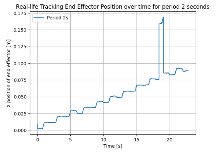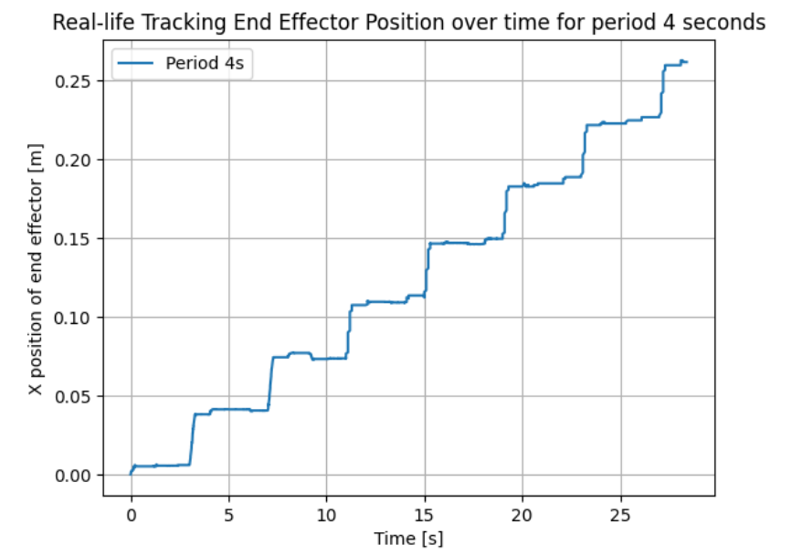 In hardware, the main anomalies are incomplete steps, occasional backward slips, and tracking artefacts. The 2 s dataset contains a clear outlier where the tracked point briefly jumps to roughly twice its nominal x-position before returning; this spike is treated as a measurement error and ignored when interpreting the overall trend. Across periods, the real prototype also shows cycle-to-cycle variability due to hinge sag, servo backlash, and non-uniform pad contact, which explains the rounded “stairs” and small regressions in the experimental plots. These observations point to concrete improvements: refining the MuJoCo model with better servo dynamics (torque and velocity limits, first-order response), calibrated hinge stiffness/damping, and slightly asymmetric or anisotropic friction pads to suppress sideways drift; and improving the physical robot with stiffer hinge reinforcement, higher-contrast and more durable friction pads, tighter servo timing on the ESP32, repeated trials with averaged performance, and more robust tracking (fixed camera, fiducial markers, simple smoothing), all of which should reduce the gap between simulated and measured x-position traces.